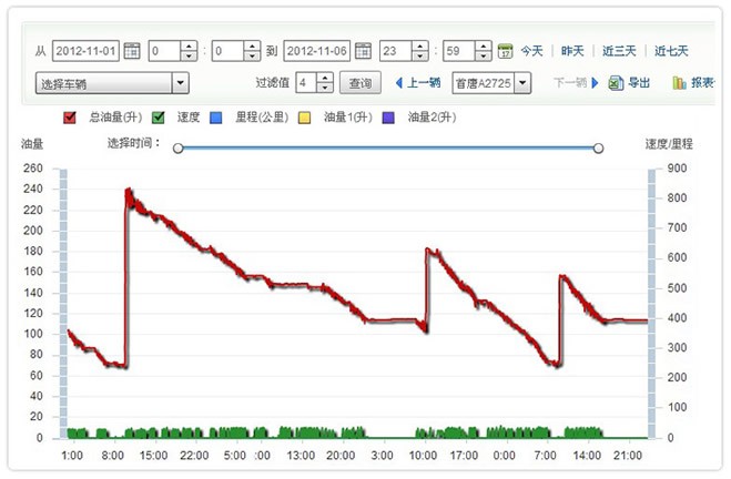 | 車(chē)輛總數: 1(輛) 總里程: 1762.33(公里) 總油耗: 646.60(升) 超速次數: 0(次) 停車(chē)超時(shí)次數: 273(次) 加油量: 397.44(升) 漏油量: 0.00(升) |